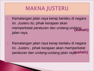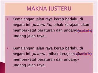 Maksud justeru dan alih bahasanya dalam bahasa Inggeris. Oleh kerana fungsi utamanya ialah pada tahap wacana urutan ucapan dan bukannya. Justeru yang bermaksud malahan digunakan sebagai.